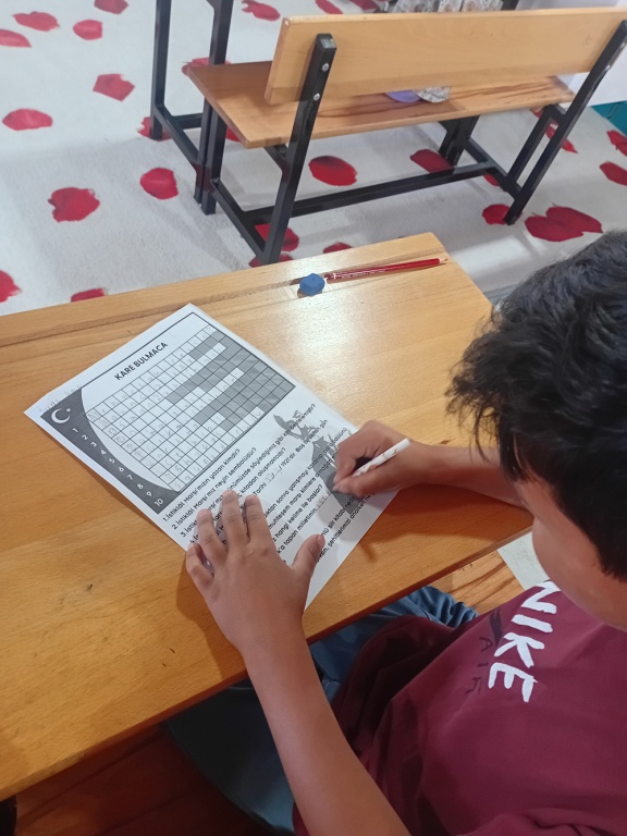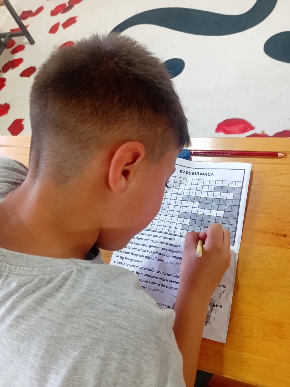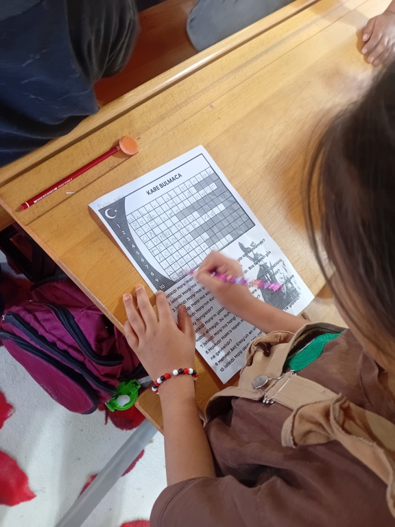 Öğrenciler, İstiklâl Marşı’ndaki sözcükleri içeren kare bulmacaları çözerek hem öğrenme süreçlerini pekiştirdiler hem de kelime dağarcıklarını geliştirdiler. Bu etkinlik, öğrencilerin eğlenerek bilgilerini gözden geçirmesine yardımcı oldu.